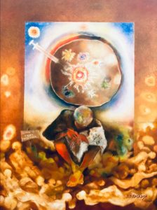 ಡಾ|| ಜಗದೀಶ್ ಬಾಣಂಕಿ ಯವರ ಈ ಅದ್ಭುತ ಕಲಾಕೃತಿಯಲ್ಲಿ ವ್ಯಕ್ತಿ ಕುಳಿತ ಕೆಳ ಭಾಗದಲ್ಲಿ ಸಾವು ನೋವಿನ ಚಿತ್ರಣ ಮನ ಕರಗುವಂತೆ ಚಿತ್ರಿಸಲಾಗಿದೆ. ತನ್ನ ಶಿರದ ಮೇಲೆ ಭೂಮಂಡಲವನ್ನು ತೋರಿಸಿ ಅದರ ಒಳಭಾಗದಲ್ಲಿ ‘ಕೊರೋನಾ’ ವೈರಾಣುಗಳನ್ನು ಚಿತ್ರಿಸಲಾಗಿದೆ. ಹಾಗೂ ಇಡೀ ಭೂಮಂಡಲಕ್ಕೆ ಚುಚ್ಚುಮದ್ದಿನ ಮೂಲಕ ಔಷಧಿ ನೀಡುತ್ತಿರುವುದು ಮಾರ್ಮಿಕವಾಗಿದೆ. ಒಟ್ಟಾರೆಯಾಗಿ ಹೇಳುವುದಾದರೆ, ಈ ಚಿತ್ರವು ಪ್ರಸ್ತುತ ಜಗತ್ತಿ‌ನ ಭವಿಷ್ಯವಿರುವ ಪಂಚಾಂಗದಂತಿದೆ. ಮುಂದೆ ಹಲವಾರು ವರ್ಷಗಳ ಕಾಲ ಈ ಚಿತ್ರವು ಜನಮಾನಸದಲ್ಲಿ ‘ಅಚ್ಚ ಹಸಿರಾಗಿ’ ಉಳಿಯಲಿದೆ.
